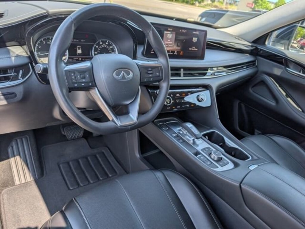 CARFAX One-Owner. Clean CARFAX. Certified. 2024 INFINITI QX60 PURE FWD This charming 2024 INFINITI QX60 PURE in Mineral Black features INFINITI Certified Pre-Owned Certified, 3rd row seats: bench, 4-Wheel Disc Brakes, 4.33 Axle Ratio, 9 Speakers, ABS brakes, Air Conditioning, Alloy wheels, AM/FM radio: SiriusXM, Anti-whiplash front head restraints, Apple CarPlay/Android Auto, Auto High-beam Headlights, Auto-dimming Rear-View mirror, Automatic temperature control, Blind Spot Warning, Brake assist, Bumpers: body-color, Delay-off headlights, Driver door bin, Driver vanity mirror, Dual front impact airbags, Dual front side impact airbags, Electronic Stability Control, Emergency communication system: INFINITI InTouch, Four wheel independent suspension, Front anti-roll bar, Front Bucket Seats, Front Center Armrest, Front dual zone A/C, Front reading lights, Fully automatic headlights, Heated door mirrors, Heated Front Bucket Seats, Heated front seats, Heated steering wheel, Illuminated entry, INFINITI Radiant Illuminated Kick Plates, Knee airbag, Leather Shift Knob, Leather steering wheel, Leather-Appointed Seating Surfaces, Low tire pressure warning, Memory seat, Occupant sensing airbag, Outside temperature display, Overhead airbag, Overhead console, Panic alarm, Passenger door bin, Passenger vanity mirror, Power door mirrors, Power driver seat, Power Liftgate, Power moonroof, Power passenger seat, Power steering, Power windows, Radio data system, Radio: AM/FM Audio System, Rain sensing wipers, Rear air conditioning, Rear anti-roll bar, Rear Parking Sensors, Rear reading lights, Rear seat center armrest, Rear side impact airbag, Rear window defroster, Rear window wiper, Reclining 3rd row seat, Remote keyless entry, Security system, Speed control, Speed-sensing steering, Speed-Sensitive Wipers, Splash Guards (Set of 4), Split folding rear seat, Spoiler, Steering wheel mounted audio controls, Tachometer, Telescoping steering wheel, Tilt steering wheel, Traction control, Trip computer, Turn signal indicator mirrors, Variably intermittent wipers, and Wheels: 18" x 8J Machined Aluminum Alloy. Shop 100% Online and We Will Come To You! 9-Speed Automatic 3.5L V6 DOHC 24V