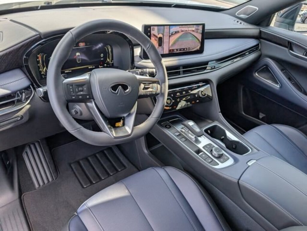 CARFAX One-Owner. Clean CARFAX. Certified. 2026 INFINITI QX60 SPORT AWD This handsome 2026 INFINITI QX60 SPORT in Radiant White/Black Obsidian features Dark Cargo Package (Black Rear Bumper Film, Cargo Blocks, Cargo Mat, and Medic Kit), INFINITI Certified Pre-Owned Certified, 17 Speakers, 2-Tone Super Premium Paint, 3rd row seats: bench, 4-Wheel Disc Brakes, ABS brakes, Air Conditioning, Alloy wheels, AM/FM radio: SiriusXM with 360L, Anti-whiplash front head restraints, Apple CarPlay/Android Auto, Auto High-beam Headlights, Auto tilt-away steering wheel, Auto-dimming door mirrors, Auto-dimming Rear-View mirror, Automatic temperature control, Black Roof Rail Crossbars, Bose Performance Series 17-Speaker Sound System, Brake assist, Bumpers: body-color, Carpeted Floor Mats with Captains Chairs on 3rd Row Tray, Climate Controlled Front Bucket Seats, Delay-off headlights, Driver door bin, Driver vanity mirror, Dual front impact airbags, Dual front side impact airbags, Electronic Stability Control, Emergency communication system: INFINITI InTouch, Four wheel independent suspension, Front anti-roll bar, Front Bucket Seats, Front Center Armrest, Front dual zone A/C, Front reading lights, Fully automatic headlights, Garage door transmitter: HomeLink, Genuine wood door panel insert, Heated door mirrors, Heated front seats, Heated rear seats, Heated steering wheel, Illuminated entry, INFINITI Radiant Dark Illuminated Kick Plates, Knee airbag, Leather Shift Knob, Leather steering wheel, Literature Kit, Low tire pressure warning, Memory seat, Navigation system: Google Built-in, Occupant sensing airbag, Outside temperature display, Overhead airbag, Overhead console, Panic alarm, Passenger door bin, Passenger vanity mirror, Power door mirrors, Power driver seat, Power Liftgate, Power moonroof: Panoramic, Power passenger seat, Power steering, Power windows, Radio data system, Radio: Klipsch Premium Audio System, Rain sensing wipers, Rear air conditioning, Rear anti-roll bar, Rear reading lights, Rear side impact airbag, Rear window defroster, Rear window wiper, Reclining 3rd row seat, Remote keyless entry, Security system, Speed control, Speed-sensing steering, Speed-Sensitive Wipers, Splash Guards, Split folding rear seat, Spoiler, Steering wheel memory, Steering wheel mounted audio controls, Tachometer, Tailorfit-Appointed Seating Surfaces, Telescoping steering wheel, Tilt steering wheel, Traction control, Trip computer, Turn signal indicator mirrors, Variably intermittent wipers, Ventilated front seats, and Wheels: 20" x 8J Unique Sporty Machined Aluminum Alloy. Shop 100% Online and We Will Come To You! 9-Speed Automatic 2.0L I4 PDI Turbocharged DOHC 16V 268hp