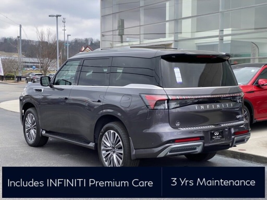 This terrific-looking 2025 INFINITI QX80 LUXE in Anthracite Gray features Cargo Package (Cargo Blocks/Stabilizers, Cargo Net, Carpeted Cargo Area Protector, Console Net, and Soft-Sided Cargo Cooler), Exterior Package (Matte Chrome Rear Bumper Protector and Silver Cross Bars), 14 Speakers, 3rd row seats: bench, 4-Wheel Disc Brakes, ABS brakes, Adaptive suspension, Air Conditioning, Alloy wheels, AM/FM radio: SiriusXM with 360L, Anti-whiplash front head restraints, Apple CarPlay/Android Auto, Audio memory, Auto High-beam Headlights, Auto tilt-away steering wheel, Auto-dimming door mirrors, Auto-dimming Rear-View mirror, Auto-leveling suspension, Automatic temperature control, Brake assist, Bumpers: body-color, Center Front Spoiler, Climate Controlled Front Bucket Seats, Compass, Delay-off headlights, Driver door bin, Driver vanity mirror, Dual front impact airbags, Dual front side impact airbags, Electronic Stability Control, Emergency communication system: INFINITI InTouch, Four wheel independent suspension, Front anti-roll bar, Front Bucket Seats, Front Center Armrest, Front dual zone A/C, Front reading lights, Fully automatic headlights, Garage door transmitter: myQ Connected Garage, Heads-Up Display, Heated door mirrors, Heated front seats, Heated rear seats, Heated steering wheel, HVAC memory, Illuminated entry, Knee airbag, Leather Seating Surfaces, Leather steering wheel, Literature Kit, Low tire pressure warning, Memory seat, Navigation system: Google Built-in, Occupant sensing airbag, Outside temperature display, Overhead airbag, Overhead console, Panic alarm, Passenger door bin, Passenger vanity mirror, Power door mirrors, Power driver seat, Power Liftgate, Power moonroof, Power passenger seat, Power steering, Power windows, Premium Paint, Radiant Front & Rear Doors Illuminated Kick Plates, Radio data system, Radio: Klipsch Premium Audio System w/14 Speakers, Rain sensing wipers, Rear air conditioning, Rear anti-roll bar, Rear reading lights, Rear seat center armrest, Rear window defroster, Rear window wiper, Reclining 3rd row seat, Remote keyless entry, Security system, Speed control, Speed-sensing steering, Splash Guards, Split folding rear seat, Spoiler, Steering wheel memory, Steering wheel mounted audio controls, Tachometer, Telescoping steering wheel, Tilt steering wheel, Traction control, Trip computer, Turn signal indicator mirrors, Variably intermittent wipers, Ventilated front seats, Ventilated rear seats, and Wheels: 22" x 8" Cast Aluminum Alloy. Shop 100% Online and We Will Come To You!