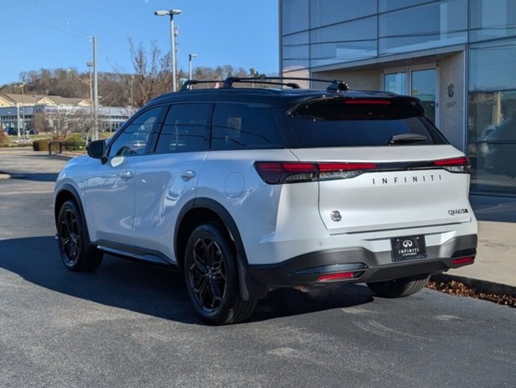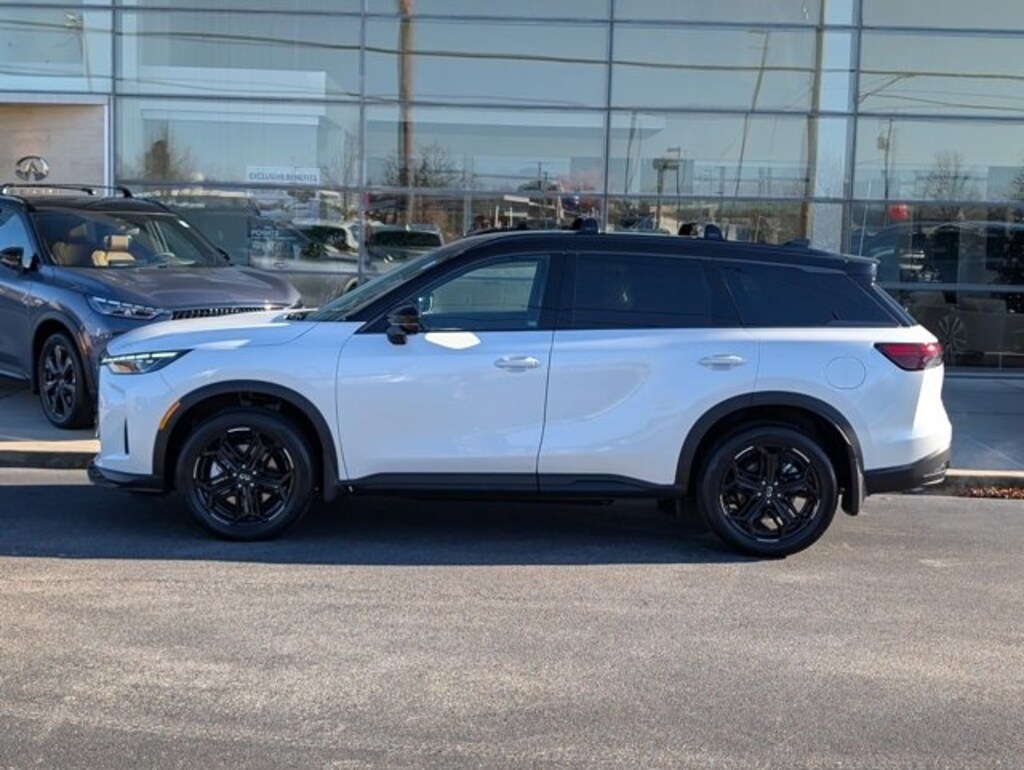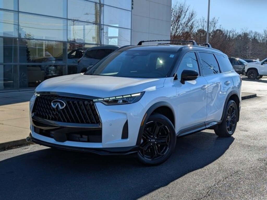 This outstanding-looking 2026 INFINITI QX60 SPORT in Radiant White/Black Obsidian features Dark Cargo Package (Black Rear Bumper Film, Cargo Blocks, and Cargo Mat), 17 Speakers, 2-Tone Super Premium Paint, 3rd row seats: bench, 4-Wheel Disc Brakes, ABS brakes, Air Conditioning, Alloy wheels, AM/FM radio: SiriusXM with 360L, Anti-whiplash front head restraints, Apple CarPlay/Android Auto, Auto High-beam Headlights, Auto tilt-away steering wheel, Auto-dimming door mirrors, Auto-dimming Rear-View mirror, Automatic temperature control, Black Roof Rail Crossbars, Bose Performance Series 17-Speaker Sound System, Brake assist, Bumpers: body-color, Carpeted Floor Mats with Captains Chairs on 3rd Row Tray, Climate Controlled Front Bucket Seats, Delay-off headlights, Driver door bin, Driver vanity mirror, Dual front impact airbags, Dual front side impact airbags, Electronic Stability Control, Emergency communication system: INFINITI InTouch, Four wheel independent suspension, Front anti-roll bar, Front Bucket Seats, Front Center Armrest, Front dual zone A/C, Front reading lights, Fully automatic headlights, Garage door transmitter: HomeLink, Genuine wood door panel insert, Heated door mirrors, Heated front seats, Heated rear seats, Heated steering wheel, Illuminated entry, Knee airbag, Leather Shift Knob, Leather steering wheel, Literature Kit, Low tire pressure warning, Memory seat, Navigation system: Google Built-in, Occupant sensing airbag, Outside temperature display, Overhead airbag, Overhead console, Panic alarm, Passenger door bin, Passenger vanity mirror, Power door mirrors, Power driver seat, Power Liftgate, Power moonroof: Panoramic, Power passenger seat, Power steering, Power windows, Radio data system, Radio: Klipsch Premium Audio System, Rain sensing wipers, Rear air conditioning, Rear anti-roll bar, Rear reading lights, Rear side impact airbag, Rear window defroster, Rear window wiper, Reclining 3rd row seat, Remote keyless entry, Security system, Speed control, Speed-sensing steering, Speed-Sensitive Wipers, Splash Guards, Split folding rear seat, Spoiler, Steering wheel memory, Steering wheel mounted audio controls, Tachometer, Tailorfit-Appointed Seating Surfaces, Telescoping steering wheel, Tilt steering wheel, Traction control, Trip computer, Turn signal indicator mirrors, Variably intermittent wipers, Ventilated front seats, and Wheels: 20" x 8J Unique Sporty Machined Aluminum Alloy. Shop 100% Online and We Will Come To You!