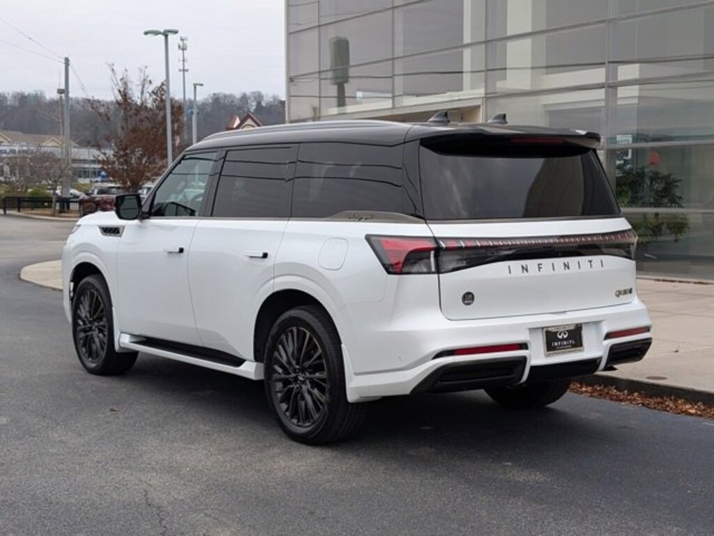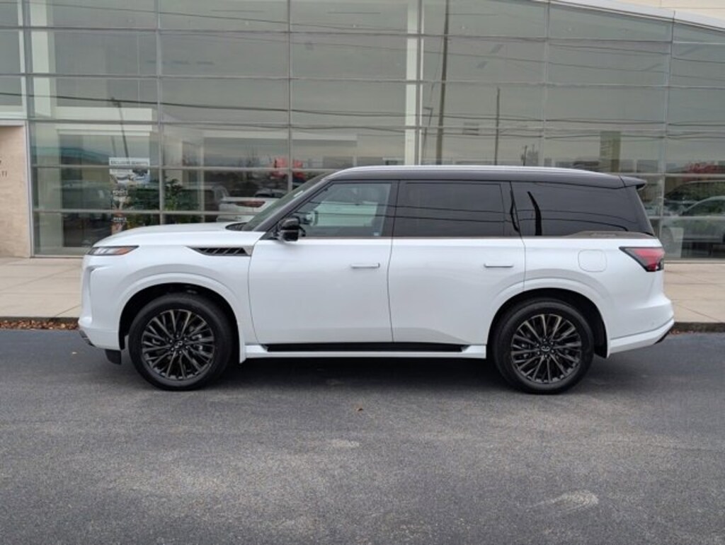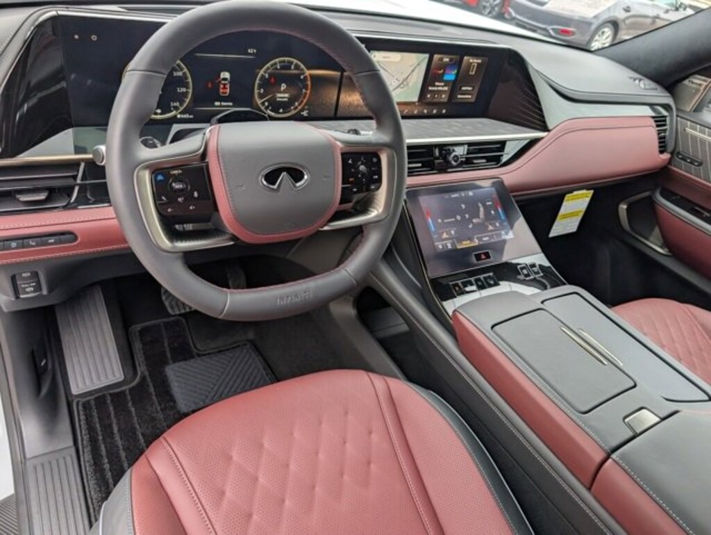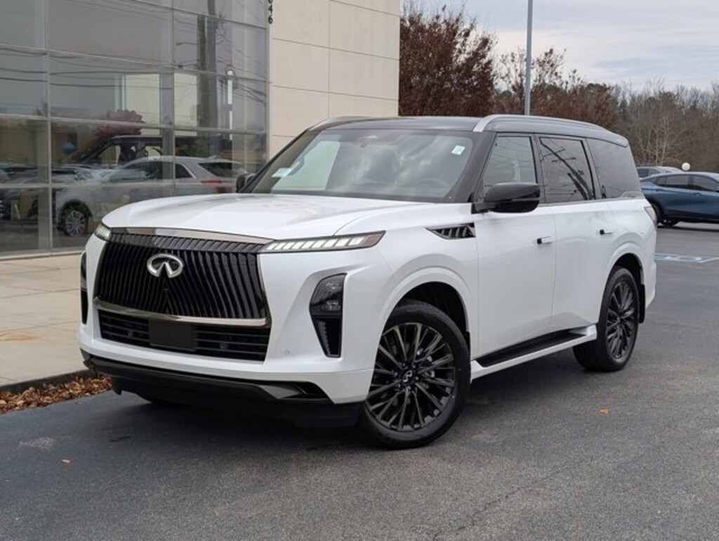 This attractive 2026 INFINITI QX80 AUTOGRAPH in Radiant White/Black Obsidian features Premium Cargo Package (Cargo Blocks/Stabilizers, Cargo Shelf/Barrier, Carpeted Cargo Area Protector, Console Net, and Soft-Sided Cargo Cooler), 3rd row seats: bench, 4-Wheel Disc Brakes, ABS brakes, Adaptive suspension, Air Conditioning, Alloy wheels, AM/FM radio: SiriusXM with 360L, Anti-whiplash front head restraints, Apple CarPlay/Android Auto, Audio memory, Auto High-beam Headlights, Auto tilt-away steering wheel, Auto-dimming door mirrors, Auto-dimming Rear-View mirror, Auto-leveling suspension, Automatic temperature control, Brake assist, Bumpers: body-color, Compass, Delay-off headlights, Driver door bin, Driver vanity mirror, Dual front impact airbags, Dual front side impact airbags, Electronic Stability Control, Emergency communication system: INFINITI InTouch, Four wheel independent suspension, Front anti-roll bar, Front Bucket Seats, Front Center Armrest, Front dual zone A/C, Front reading lights, Fully automatic headlights, Garage door transmitter: myQ Connected Garage, Genuine wood dashboard insert, Genuine wood door panel insert, Heads-Up Display, Heated and Climate Controlled Front Bucket Seats with Massage, Heated door mirrors, Heated front seats, Heated rear seats, Heated steering wheel, HVAC memory, Illuminated entry, Knee airbag, Leather steering wheel, Low tire pressure warning, Memory seat, Navigation system: Google Built-in, Occupant sensing airbag, Outside temperature display, Overhead airbag, Overhead console, Panic alarm, Passenger door bin, Passenger vanity mirror, Power door mirrors, Power driver seat, Power Liftgate, Power moonroof, Power passenger seat, Power steering, Power windows, Radio data system, Radio: Klipsch Premiere Audio System, Rain sensing wipers, Rear air conditioning, Rear anti-roll bar, Rear reading lights, Rear seat center armrest, Rear window defroster, Rear window wiper, Reclining 3rd row seat, Remote keyless entry, Security system, Semi-Aniline Premium Leather Seating Surfaces, Speed control, Speed-sensing steering, Splash Guards, Split folding rear seat, Spoiler, Steering wheel memory, Steering wheel mounted audio controls, Tachometer, Telescoping steering wheel, Tilt steering wheel, Traction control, Trip computer, Turn signal indicator mirrors, Two-Tone Super Premium Paint, Variably intermittent wipers, Ventilated front seats, Ventilated rear seats, and Wheels: 22" x 8.5J Cast Aluminum-Alloy. Shop 100% Online and We Will Come To You!