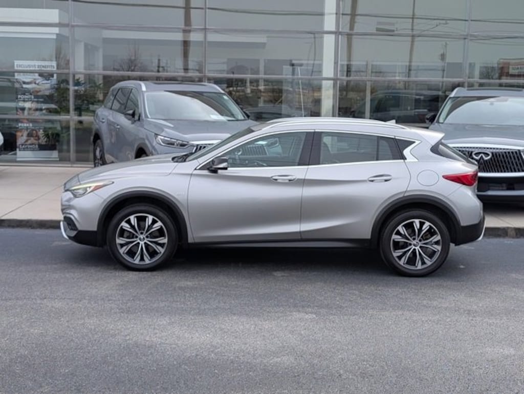 2017 INFINITI QX30 Luxury AWD This terrific-looking 2017 INFINITI QX30 Luxury in Blade Silver features 18" x 7" Aluminum Alloy Wheels, 2.654 Axle Ratio, 4-Wheel Disc Brakes, 6 Speakers, ABS brakes, Air Conditioning, Alloy wheels, AM/FM radio: SiriusXM, Auto-dimming door mirrors, Auto-dimming Rear-View mirror, Automatic temperature control, Block heater, Brake assist, Bumpers: body-color, CD player, Delay-off headlights, Driver door bin, Driver vanity mirror, Dual front impact airbags, Dual front side impact airbags, Electronic Stability Control, Four wheel independent suspension, Front anti-roll bar, Front Bucket Seats, Front Center Armrest, Front dual zone A/C, Front reading lights, Fully automatic headlights, Heated door mirrors, Heated Front Bucket Seats, Heated front seats, Illuminated entry, Knee airbag, Leather Shift Knob, Leather steering wheel, Low tire pressure warning, Memory seat, Nappa Leather Seat Trim, Occupant sensing airbag, Outside temperature display, Overhead airbag, Overhead console, Panic alarm, Passenger door bin, Passenger vanity mirror, Power door mirrors, Power driver seat, Power passenger seat, Power steering, Power windows, Radio data system, Radio: AM/FM/CD/HD/SAT Audio System, Rear anti-roll bar, Rear fog lights, Rear seat center armrest, Rear window defroster, Rear window wiper, Remote keyless entry, Roof rack: rails only, Security system, Speed control, Speed-sensing steering, Split folding rear seat, Spoiler, Steering wheel mounted audio controls, Tachometer, Telescoping steering wheel, Tilt steering wheel, Traction control, Trip computer, Turn signal indicator mirrors, and Variably intermittent wipers. Shop 100% Online and We Will Come To You! 7-Speed Automatic 2.0L I4 Turbocharged