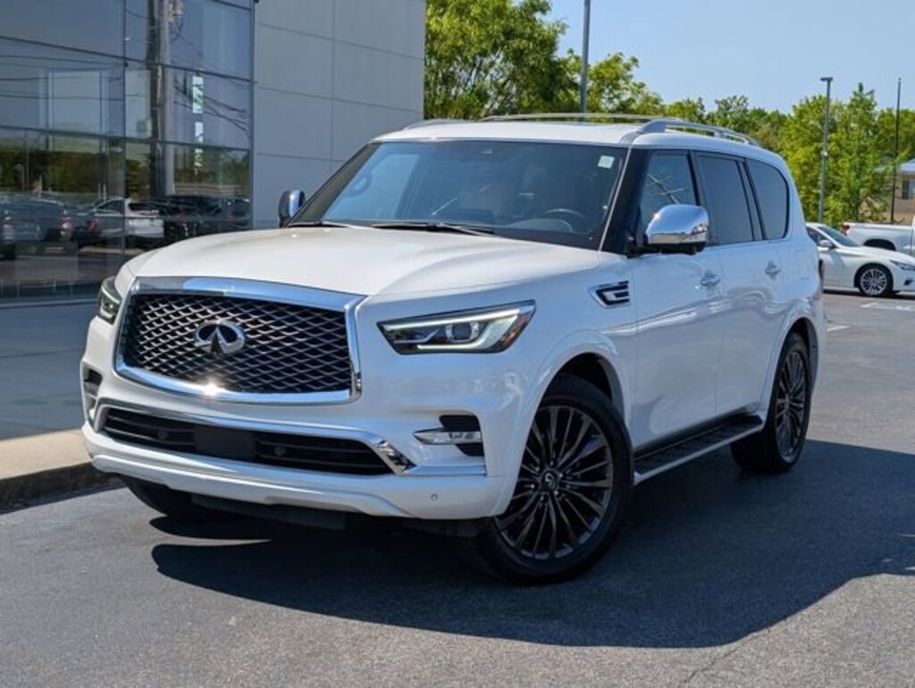 CARFAX One-Owner. Clean CARFAX. 2023 INFINITI QX80 Sensory 4WD This wonderful-looking 2023 INFINITI QX80 Sensory in Moonstone White features Cargo Package (Cargo Net, Carpeted Cargo Mat, Center Console Tray, Console Net, and First-Aid Kit), 17 Speakers, 2.937 Axle Ratio, 3rd row seats: split-bench, 4-Wheel Disc Brakes, ABS brakes, Air Conditioning, Alloy wheels, AM/FM radio: SiriusXM, Anti-whiplash front head restraints, Auto High-beam Headlights, Auto tilt-away steering wheel, Auto-dimming door mirrors, Auto-dimming Rear-View mirror, Auto-leveling suspension, Automatic temperature control, Brake assist, Bumpers: body-color, Climate Controlled Front Bucket Seats, Compass, Delay-off headlights, Driver door bin, Driver vanity mirror, Dual front impact airbags, Dual front side impact airbags, Electronic Stability Control, Emergency communication system: INFINITI InTouch, Four wheel independent suspension, Front anti-roll bar, Front Bucket Seats, Front Center Armrest, Front dual zone A/C, Front fog lights, Front reading lights, Fully automatic headlights, Garage door transmitter: HomeLink, Heated door mirrors, Heated front seats, Heated rear seats, Heated steering wheel, Illuminated entry, INFINITI Radiant Illuminated Kick Plates, Leather Shift Knob, Leather steering wheel, Literature Kit, Low tire pressure warning, Memory seat, Midyear Change, Navigation system: INFINITI InTouch Navigation, Occupant sensing airbag, Outside temperature display, Overhead airbag, Overhead console, Panic alarm, Passenger door bin, Passenger vanity mirror, Perforated Semi-Aniline Leather-Appointed Seats, Power door mirrors, Power driver seat, Power Liftgate, Power moonroof, Power passenger seat, Power steering, Power windows, Premium audio system: Bose, Radio data system, Radio: Bose Performance Audio System w/17 Speakers, Rain sensing wipers, Rear air conditioning, Rear anti-roll bar, Rear reading lights, Rear seat center armrest, Rear window defroster, Rear window wiper, Rear-Seat Entertainment, Reclining 3rd row seat, Remote keyless entry, Roof Rail Cross Bars, Security system, Speed control, Speed-sensing steering, Split folding rear seat, Spoiler, Steering wheel memory, Steering wheel mounted audio controls, Tachometer, Telescoping steering wheel, Tilt steering wheel, Traction control, Trip computer, Turn signal indicator mirrors, Variably intermittent wipers, Ventilated front seats, Voltmeter, and Wheels: 22" x 8.0" Dark Chrome Cast Aluminum-Alloy. Shop 100% Online and We Will Come To You! 7-Speed Automatic 5.6L V8
