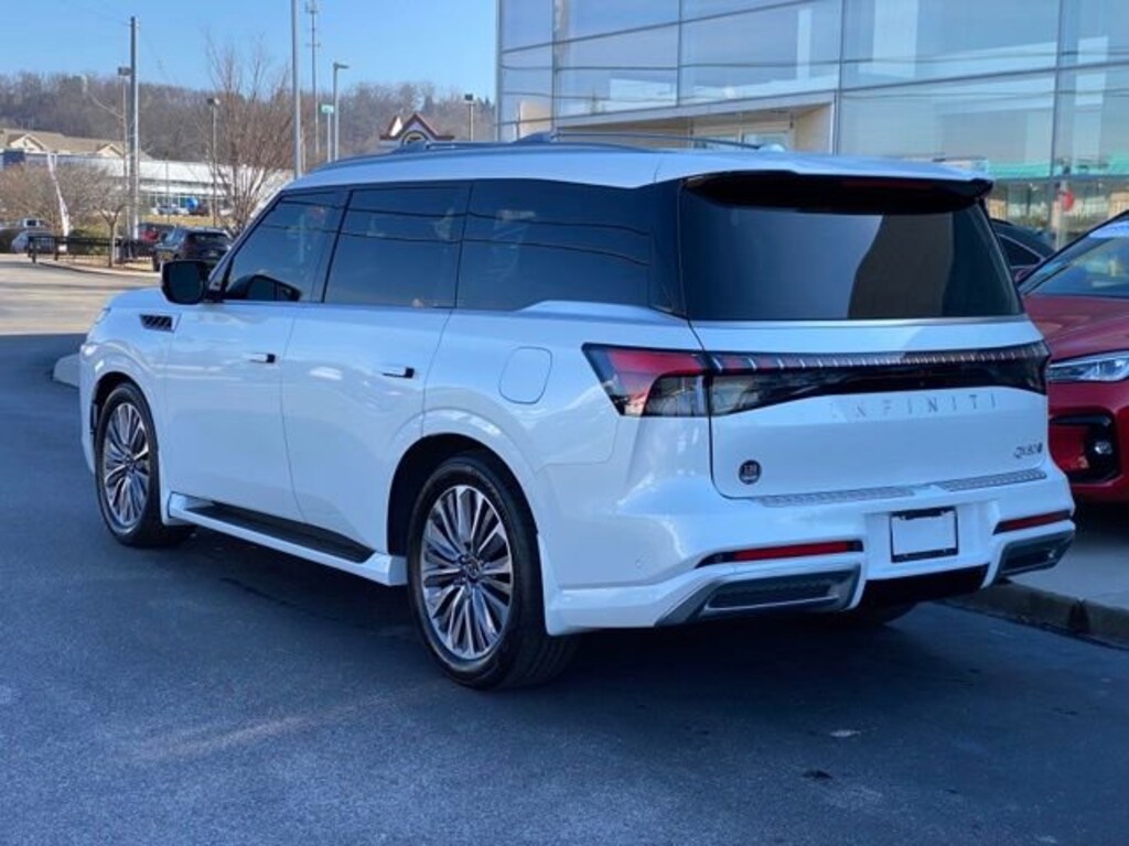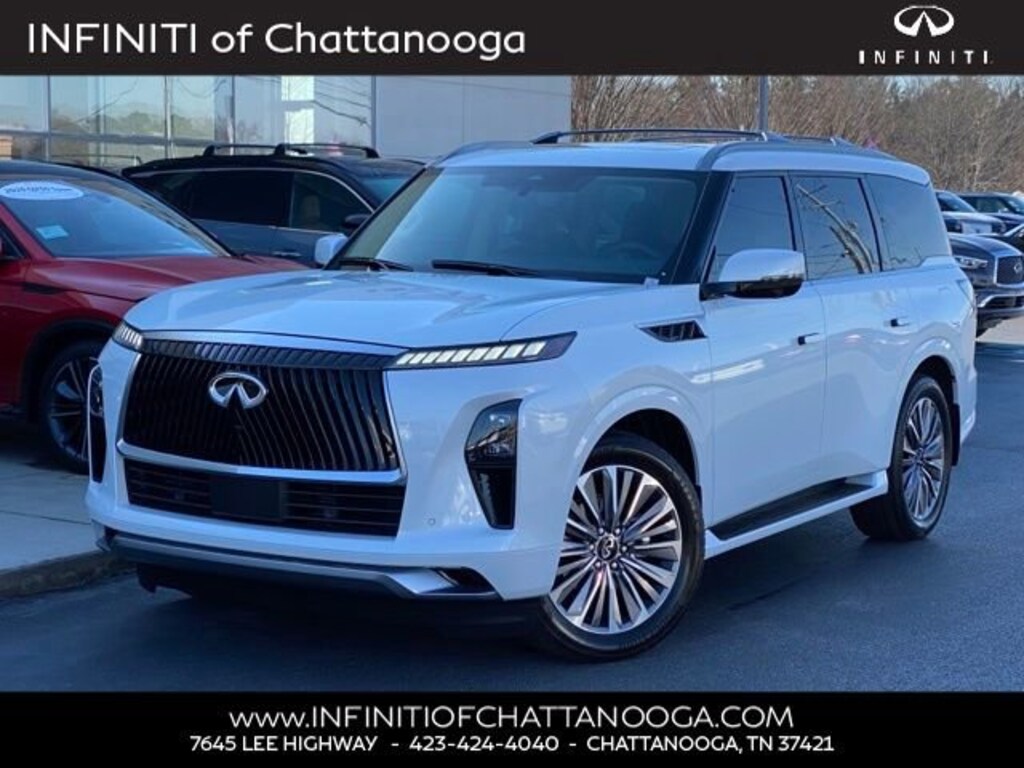 CARFAX One-Owner. 2025 INFINITI QX80 SENSORY 4WD Backup Camera, Bluetooth, Navigation, Sunroof/Moonroof, Leather Seats, Third Row Seats, Push Button Start, Apple Carplay / Andriod Auto, Recent Arrival, QX80 Sensory, 3.5L V6 DOHC 24V, 9-Speed Automatic, 4WD, Radiant White, Graphite Leather, 3rd row seats: bench, 4-Wheel Disc Brakes, ABS brakes, Adaptive suspension, Air Conditioning, Alloy wheels, AM/FM radio: SiriusXM with 360L, Anti-whiplash front head restraints, Audio memory, Auto High-beam Headlights, Auto-leveling suspension, Automatic temperature control, Brake assist, Cargo Blocks, Console Net, Delay-off headlights, Dual front impact airbags, Dual front side impact airbags, Electronic Stability Control, Emergency communication system: INFINITI InTouch, Exterior Package, Four wheel independent suspension, Front anti-roll bar, Front Bucket Seats, Front Center Armrest, Front dual zone A/C, Fully automatic headlights, Heads-Up Display, Heated front seats, Heated rear seats, HVAC memory, Knee airbag, Literature Kit, Low tire pressure warning, Matte Chrome Rear Bumper Protector, Memory seat, Navigation system: Google Built-in, Occupant sensing airbag, Overhead airbag, Panic alarm, Passenger door bin, Power driver seat, Power Liftgate, Power moonroof, Power passenger seat, Power steering, Power windows, Premium Cargo Package, Radio data system, Radio: Klipsch Reference Premiere Audio System, Rain sensing wipers, Rear air conditioning, Rear anti-roll bar, Rear window defroster, Rear window wiper, Reclining 3rd row seat, Remote keyless entry, Reversible Cargo Mat, Security system, Semi-Aniline Premium Leather Seating Surfaces, Silver Cross Bars, Smart Luggage Shelf, Soft Sided Cooler, Speed-sensing steering, Steering wheel memory, Steering wheel mounted audio controls, Traction control, Umbrella Holder, Variably intermittent wipers, Ventilated front seats, Ventilated rear seats, Wheels: 22" x 8" Cast Aluminum Alloy. 9-Speed Automatic 3.5L V6 DOHC 24V